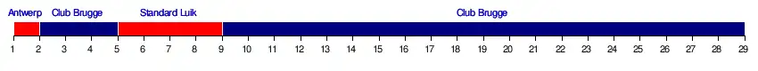 | 1 | Club Brugge | 29 | 21 | 7 | 1 | 70 | 58 | 14 | +44 | Kampioen, Groepsfase Champions League |