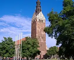 De oude stadskern (Altstadt) is aan het einde van de Tweede Wereldoorlog grotendeels verwoest. De kerken bleven gedeeltelijk overeind. Na de oorlogsverwoestingen zijn deze herbouwd en na 1990 zijn ook een aantal oude straten in historische stijl gereconstrueerd. Een belangrijk gebouw is een driebeukige hallenkerk in baksteengotiek uit de 13e eeuw met een 95 m hoge toren. Dit was tot 1945 de lutherse Stadtpfarrkirche, en werd daarna de rooms-katholieke kathedraal Sint-Nicolaas (Katedra św. Mikołaja). De oorspronkelijke toren werd in 1777 door brand verwoest en is pas in 1906 herbouwd. In 1945 bleef de kerk vrijwel ongeschonden. Twee andere middeleeuwse kerkgebouwen, de Mariakerk en de Heilige Geestkerk (met voormalig hospitaal), zijn na hun restauratie thans respectievelijk in gebruik als galerie en als bibliotheek.