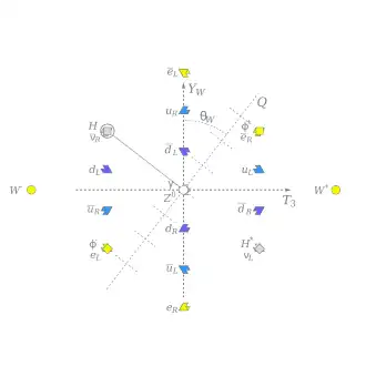 In het Standaardmodel worden de W± en Z0 bosonen en het foton geproduceerd door spontane symmetriebreuk van de elektrozwakke symmetrie van SU(2) × U(1)Y naar U(1)em, veroorzaakt door het Higgsmechanisme (zie ook Higgsboson).[1][2][3][4] U(1)Y en U(1)em zijn verschillende kopieën van U(1); de generator van U(1)em is Q = Y/2 + I3, waarin Y de generator is van U(1)Y (zwakke hyperlading genoemd), en I3 een van de SU(2) generatoren (een component van zwakke isospin is).