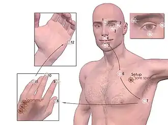 - De onbewuste weerstand tegen genezing en het onbewust vasthouden van de problematiek wordt doorbroken door het uitspreken van de affirmatietekst "Ik accepteer mezelf helemaal ondanks [het probleem]", terwijl gewreven wordt op de "sore spot" (het neurolymfatisch-reflexpunt uit de toegepaste kinesiologie, zie plaatje) of geklopt op het "karatepunt".