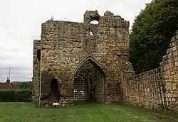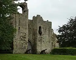Etal Castle met links de donjon en rechts het poortgebouw. | ||