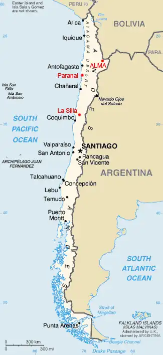 De ESO beheert drie sterrenwachten in Chili, een op La Silla, ten oosten van La Serena, de ander op Paranal, ten zuiden van Antofagasta. Op Paranal bevindt zich de Very Large Telescope (VLT). Op de hoogvlakte van Chajnantor is op 5000 meter hoogte, samen met andere organisaties uit de Verenigde Staten en Japan, de Atacama Large Millimeter Array (ALMA, een interferometer voor microgolven) gebouwd. Dit project begon eind jaren 90 en was in maart 2013 volledig operationeel.[1]