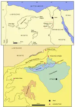 - Dit artikel of een eerdere versie ervan is een (gedeeltelijke) vertaling van het artikel Faiyum Oasis op de Engelstalige Wikipedia, dat onder de licentie Creative Commons Naamsvermelding/Gelijk delen valt. Zie de bewerkingsgeschiedenis aldaar.