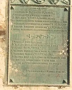 — «Proveniente da Suez diretta a CalcuttaDoppiava questo Capo nell’ottobre 1871 La nave mista “Emilia”, tonnellate 1046. Primo piroscafo italiano che tentasse il nuovo traffico con le Indie. La comandava il venticinquenne Capitano DE ALBERTIS. l’intrepido navigatore oceanico del “CORSARO” Campione ancora vivente dello spirito marinaro di nostra gente ⸻ Deposta la spada per il timone Il Veterano delle guerre di liberazione d’Italia Generale NINO BIXIO Con ardore di marinaio pari al valore del condottiero Comandava il piroscafo “MADDALONI” La seconda delle navi italiane che solcava queste acque Per interesse e floridi commerci d’oltre mare Sul quale la Patria rinnovata fonda le sue speranze.