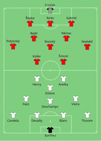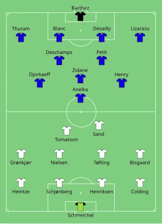 Frankrijk startte het toernooi met een overtuigende 3-0 zege tegen Denemarken en won vervolgens ook met 2-1 van Tsjechië. Met zes punten deelde het team van Lemerre de eerste plaats met Nederland. In het laatste groepsduel won Oranje met 2-3 van de Fransen, die het daardoor in de volgende ronde moesten opnemen tegen Spanje, de winnaar van groep C. Frankrijk won met 2-1, nadat de Spaanse aanvaller Raúl in de slotminuut een strafschop miste.