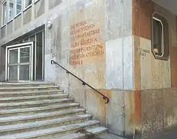 - Een gedenksteen is aangebracht bij de ingang van het gerechtsgebouw in Frankfurt.