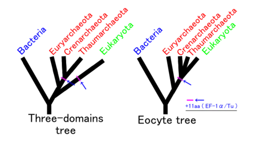 Bij verschil van inzicht ontstaan verschillende stambomen naast elkaar. Het voorbeeld toont verschillende hypothesen voor het ontstaan van de eukaryoten.[2] Links hebben alle archaea (Euryarchaeota + Crenarchaeota) en de Eukaryoten één gezamenlijke voorouder en vormen twee aparte domeinen. Rechts hebben de Eukaryoten zich pas later samen met de Crenarchaeota ontwikkeld uit één gemeenschappelijke voorouder (vanaf het pijltje). Daar vormen de Archaea en de Eukaryoten samen één domein. Links vormen de Archaea een monofyletisch taxon, rechts is die groep parafyletisch.
