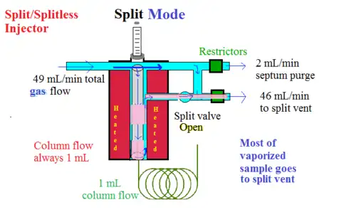 In de splitmodus regelt men de hoeveelheid geïnjecteerde stof die op de kolom komt door de "split valve" tijdens de injectie open te zetten. Dat heeft als voordeel dat enerzijds monsters die te geconcentreerd zijn, niet allemaal verdund hoeven te worden en anderzijds de hoeveelheid analiet die op de kolom gebracht wordt de chromatografie niet nadelig beïnvloed. Bij een split injectie maximaliseert men vaak de afstand tussen de spuit monding en de analytische kolom zodat zo lang mogelijke weglengte ontstaat wat het homogeen verdelen en afblazen van het monster bevordert. Ondanks dat monsters over het algemeen reproduceerbaar afgeblazen kunnen worden ziet men dat vluchtige stoffen eerder afgeblazen worden dan niet-vluchtige stoffen, dit noemt men discriminatie.