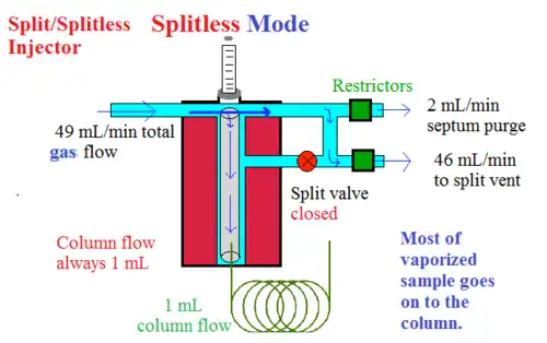 In de splitlessmodus wordt de totale hoeveelheid monster op de kolom gebracht, waardoor dit de meest gevoelige methode van injectie is. De split valve is gedurende de injectie in een gesloten positie zodat geen analiet afgeblazen wordt. Later opent men deze klep vaak wel weer om eventuele vervuilingen die achterblijven in de injector af te blazen. Bij een splitless injectie wordt de afstand tussen de analytische kolom en de monding van de injectiespuit vaak zo klein mogelijk gemaakt zodat het monster in een zo klein mogelijke band wordt geïnjecteerd.