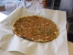 - Lahmacun (gerecht gemaakt van deeg dat belegd is met een mengsel van pikant gekruid gehakt, ui, verse tomaten, pikante pepers, en peterselie. In Nederland bekend als "Turkse pizza")