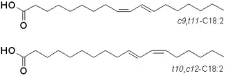 - Terwijl 9cis,11trans-CLA de insulinegevoeligheid verbetert, veroorzaakt 10trans,12cis-CLA juist insulineresistentie.[4]