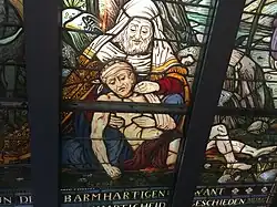 'De barmhartige Samaritaan' op een glas-in-loodraam in verzorgingshuis De Bieslandhof in Delft