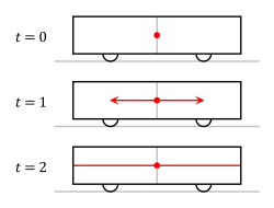 De relativiteit van gelijktijdigheid blijkt in een gedachte-experiment van een rijdende trein met in het midden van een wagon een lamp die een lichtflits afgeeft. Uit de speciale relativiteitstheorie volgt dat licht zich in elk inertiaalstelsel en in alle richtingen voortplant met een eindige, gelijke snelheid, de lichtsnelheid. In het inertiaalstelsel waarin de trein stilstaat, bereikt het licht de voorkant en de achterkant van de wagon gelijktijdig. In het inertiaalstelsel van de buitenwereld komt de achterkant van de wagon het licht tegemoet, en moet het licht de voorkant inhalen. Het licht bereikt in het inertiaalstelsel van de buitenwereld daardoor eerst de achterkant van de wagon en pas later de voorkant, dus niet gelijktijdig.