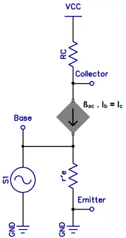 Om een functie te ontwikkelen die de AC-ingangsweerstand beschrijft, bekeken vanaf de basis gebruikt men het vereenvoudigde r-parameter model van de transistor. Figuur 5 toont het transistormodel verbonden met een externe collectorweerstand (RC). De ingangsweerstand bekeken vanaf de basis wordt gegeven door volgende formule: