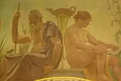 Op een boogpaneel boven de ingang naar de Raadszaal, zetelt de Raad der Wijzen. De pendant boven de ingang naar de Trouwzaal toont een huwelijksfeest.