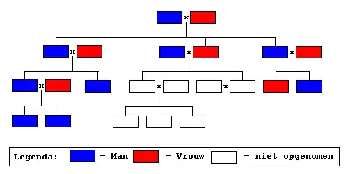 In de genealogie worden de generaties genummerd met Romeinse cijfers. De takken van een familie worden genummerd A, B, C enz., de twijgen AA, AB, AC enz. (uit tak A), BA, BB (uit tak B), CA, CB (uit tak C), enz. Een genealogie wordt meestal in een tekst weergegeven. Hieronder staat een grafisch overzicht.