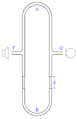 Bij dit experiment wordt gebruikgemaakt van een rondlopende buis met een vast deel A en een uitschuifbaar deel B. Op één punt (T) wordt een bepaalde toon toegevoerd en op een ander punt (O) wordt geluisterd. De lengte van buis B wordt dan zodanig gevarieerd (d) dat er in het punt O door de optredende interferentie een minimum aan geluid te horen is. De geluidsgolven die via elk van de buizen bij O aankomen, hebben dan een tegengestelde fase en heffen elkaar dus op. Aan de hand hiervan kan, door het verschil in lengte van de buisdelen A en B te meten, de golflengte van de toegevoerde geluidsgolf worden bepaald.
