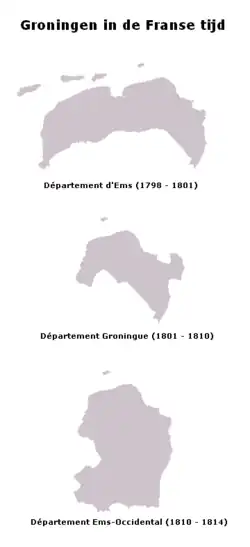 Nadat de oude gewesten uit de tijd van de Republiek in 1798 waren opgeheven, vormde Groningen aanvankelijk één staatkundig gebied met het noordelijk deel van Friesland in het departement van de Eems. Toen de Bataafse Republiek in 1801 overging in het Bataafs Gemenebest, werd deze samenvoeging weer ongedaan gemaakt. Het grondgebied van het oude gewest werd het departement Stad en Landen van Groningen. Na de omzetting in het koninkrijk Holland in 1806 werd het departement Groningen gevormd. Na de annexatie van het koninkrijk Holland door Frankrijk in 1810 werd het departement van de Westereems gevormd door samenvoeging van de voormalige departement Groningen en departement Drenthe, waaraan ook het Duitse deel van het Reiderland werd toegevoegd. In 1814, na de Franse tijd, werden Groningen en Drenthe weer gescheiden en ontstonden de huidige provincies Groningen en Drenthe.