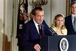 Nixon werd in 1972 met overmacht herkozen, maar kon het niet laten spionage te plegen bij zijn Democratische tegenstanders en liep daarmee vervolgens tegen de lamp ten gevolge van journalistiek speurwerk. President Nixon raakte zo verwikkeld in de affaire rond Watergate die in 1974 uitmondde in een dreigende Impeachment waarna hij zijn conclusies trok en aftrad, de tot nu toe enige president die dat deed. Zijn opvolger Gerald Ford – die eerder door Nixon was benoemd als vicepresident voor de ook al vanwege schandalen afgetreden Spiro Agnew – kon geen naam voor zichzelf maken. Vooral toen hij Nixon een algemeen pardon verleende, verloor hij veel steun bij de geërgerde Amerikanen. Pas bij zijn dood (2006) is er erkenning ontstaan voor het feit dat hij het geheel ontspoorde staatsbestel weer op de rails heeft kunnen krijgen en dat het pardon daarvoor onontbeerlijk geweest was.