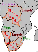 Toen de Kaapkolonie in Britse handen ging werd Engels de officiële taal. De Nederlanders (nu Boeren of Afrikaners genoemd) trokken weg steeds verder het binnenland in. Hier stichtten zij drie staten de Oranje Vrijstaat, de Transvaal en de Republiek Natalia waar Nederlands de officiële taal werd. Er ontstonden twee hevige oorlogen tegen de Britse kolonisten die de Boeren uiteindelijk zouden verliezen. De Boeren waren voor het behoud van hun taal en de tradities. In 1852 werd het Nederlands de officiële taal van de Zuid-Afrikaansche Republiek, de voorloper van het huidige Zuid-Afrika. Na 1902 tot 1960 was het Nederlands en het Engels samen de officiële talen van Zuid-Afrika. Tegenwoordig wordt de taal Afrikaans genoemd en heeft een eigen spelling en grammatica. Onderling kunnen Nederlanders, Vlamingen, en Afrikaners elkaar zonder veel moeite verstaan.