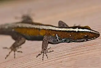 De huidkleur is oranjebruin met een witte, zwart afgezoomde streep van de snuit tot op de staart. Vrouwtjes zijn grijsbruin, met een vage, witte streep. De ogen zijn hoog op de kop gepositioneerd. De lichaamslengte bedraagt 7 tot 7,5 centimeter.