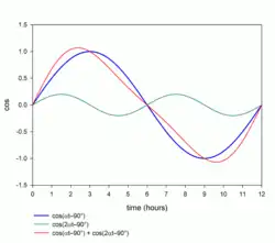 Als beide componenten niet dezelfde amplitude hebben, is het bewijs wat bewerkelijker maar ook dan is de uitkomst een harmonische kromme met dezelfde hoeksnelheid, in de vorm , waarin A de constante amplitude is, en B het constante faseverschil met . - ↑ Schureman, P. (1940). Manual of Harmonic Analysis and Prediction of Tides : Astronomical data alinea 12, p. 4
