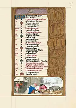 De lay-out kan men terugvinden in de ‘Codicologische omschrijving’. De tabel met heiligenfeesten is vrij eenvoudig. Bovenaan vindt men de initialen ‘KL’ in bladgoud op een geschilderde achtergrond, naast de titellijn die de maand opgeeft en het aantal dagen en in de tweede lijn het aantal dagen in de maancyclus. Daaronder zijn er drie kolommen. In de eerste vindt men het numerus aureus[12] dat toelaat om in een gegeven jaar, de dagen van nieuwe en volle maan te bepalen. Dit was belangrijk voor de berekening van de paasdatum. In de tweede kolom vindt men de zondagsletter waarmee men de dagen van de week aan de kalender kan verbinden. De kalender is nog opgesteld in functie van de Juliaanse kalender, er is dus geen rekening gehouden met het later ingevoerde schrikkeljaar. De derde kolom bevat de bijzondere feesten of de heiligen die op de betrokken dag worden gevierd. De heiligen die bijzonder vereerd werden of de belangrijke feesten werden in het rood geschreven en zijn afgebeeld in de medaillons in de marge. De tekens van de dierenriem voor september en oktober komen niet overeen met de gebruikelijke volgorde vastgelegd door Isidorus van Sevilla in zijn Etymologiae: september heeft ‘schorpioen’ en oktober ‘weegschaal’ als teken. De bas de page miniaturen stemmen overeen met die in de kalender van de Rothschild-getijden. De kalendertabel zelf is hier van het Vlaamse type: alle dagen zijn ingevuld, wat niet het geval is in de Rothschild-getijden.[13]
