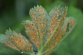| Uredinia op spitslobbige vrouwenmantel | ||||||||||||||