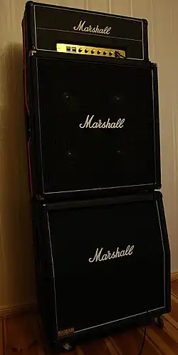 - Stack - Een stack bestaat uit twee op elkaar geplaatste luidsprekerkasten, waarbovenop de aparte versterker (top) is geplaatst. Deze combinatie wordt ook wel een toren genoemd. De versterkervermogens van zo'n toren lopen sterk uiteen. Standaard is 100 watt, maar Fender heeft tegenwoordig een stack van 550 watt. In elke luidsprekerkast van een stack zitten meestal vier luidsprekers, soms twee. Er zijn aparte stacks voor gitaren en voor basgitaren. Een combinatie van een versterker en één luidsprekerkast wordt een half stack genoemd.