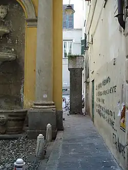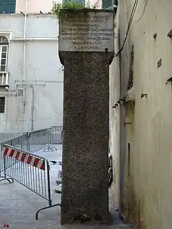 Dit betekent: Ter schandelijke herdenking van Giulio Cesare Vachèro, een zeer slecht mens die nadat hij tegen de Republiek (van Genua) had samengezworen de schuldstraf heeft betaald: het hoofd afgehakt, zijn goederen aangeslagen, zijn zonen verbannen en zijn huis verwoest.