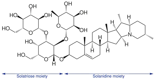Een voorbeeld hiervan is solanine in aardappelen, waarvan vooral rassen voor de zetmeelproductie een hoog gehalte kunnen hebben. Bij het proeven van deze aardappelen ontstaat er in de keel een branderig gevoel. Dit solanine is een verbinding van het alkaloïde solanidine met een suikerketen (zie figuur), en behoort derhalve ook tot de chemische groep der glycosiden.