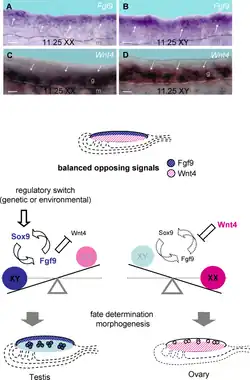 - ↑ Kim Y, Kobayashi A, Sekido R, DiNapoli L, Brennan J, Chaboissier MC, Poulat F, Behringer RR, Lovell-Badge R, Capel B (2006). Fgf9 and Wnt4 act as antagonistic signals to regulate mammalian sex determination. PLoS Biol 4:e187