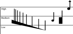 - waarin de muziek met symbolen en illustraties wordt weergegeven (deze notatie volgt de traditie van een tijd-toonhoogtegrafiek, en wordt net als traditionele notatie van links naar rechts gelezen):