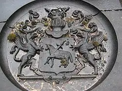 Ervoor is een tombe geplaatst, waar op de liggende grafplaat in twee cirkels in bas-reliëfs een kruis en het familiewapen Van Lamwsweerde zijn aangebracht: "In rood een zilveren lam, houdende met de linker voorpoot een omgekeerd zilveren zwaard met gouden gevest over de schouder. Een aanziende helm; een kroon van drie bladeren en twee parels; dekkleden: zilver, gevoerd van rood; helmteken: twee schuingekruiste zwaarden als van het schild."[1] Aan weerszijden van de tombe ligt een hardstenen grafplaat met daarop namen van de overleden familieleden.