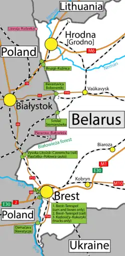 Er bestaan een zestal grensovergangen voor autoverkeer, één voor voetgangers en fietsen, en één spoorovergang bij Terespol.