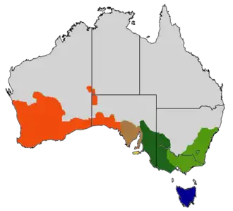 Verspreidingsgebied. Rood= S. v. plumbea; bruin = S. v. intermedia; geel = S. v. halmaturina; donkergroen = S. v. melanoptera; groen = S. v. versicolor; blauw = S. v. arguta. | ||||||||||||
