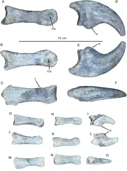 De beschrijvers stelden verschillende onderscheidende kenmerken vast. Dit waren geen autapomorfieën, unieke afgeleide eigenschappen, maar vormden wel een unieke combinatie. De achterste ruggenwervels zijn zeer langgerekt en hebben spleetvormige pneumatische openingen. Het schouderblad is smal met een golvende achterrand en vooraan een ondiepe inkeping tussen de processus acromialis en het blad. De voorpoot is verkort met gereduceerde aanhechtingen voor de spieren en een hand met maar twee functionele vingers. Het eerste en tweede middenhandsbeen zijn bovenaan vergroeid terwijl het derde middenhandsbeen gereduceerd is tot een splinter. De schaambeenderen zijn nauwelijks verbonden door een beenschort, maar hun "voeten" zijn lang, scherp en overdwars afgeplat. De kop van het dijbeen is naar binnen en boven gericht. De onderste gewrichtsknobbels van het dijbeen zijn verkleind. Het kuitbeen heeft op de bovenste achterrand een grote groeve met een aanliggende richel. De aanhechting op het kuitbeen voor de musculus iliofibularis heeft de vorm van een richel. Bij het derde middenvoetsbeen is bovenaan de achterzijde breed maar de voorzijde toegeknepen zodat de middenvoet antarctometatarsaal is. De voetklauwen hebben enkele "bloedgroeven" met een kleine spoor of bult nabij het boveneind.