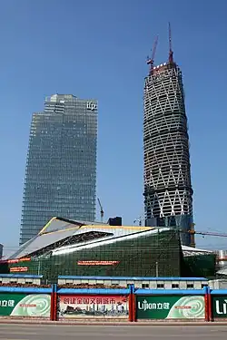 De twee torens heten Guangzhou Chow Tai Fook Finance Centre (周大福商业中心) en Guangzhou International Finance Centre (广州国际金融中心), maar worden meestal Oostelijke Toren en Westelijke Toren genoemd. De Westelijke Toren, ontworpen door architect Wilkinson Eyre, met honderddrie verdiepingen was in 2010 klaar voor gebruik. De Oostelijke Toren, ontworpen door Kohn Pedersen Fox was toen nog in aanbouw en werd in oktober 2016 geopend.