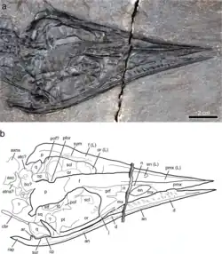 De beschrijvers stelden enkele onderscheidende kenmerken vast. Sommige daarvan zijn autapomorfieën, unieke afgeleide eigenschappen. De snuit is extreem puntig. De opgaande tak van het jukbeen helt naar achteren. De slaap is veel korter dan de oogkas. Het voorste dentarium is tandeloos. Het retroarticulair uitsteeksel is langwerpig. De doornuitsteeksels van de rug, heup en voorste staart hebben een scherpe bovenrand. De sacrale ribben zijn langwerpig en smal waarbij de verbreding aan het uiteinde minder dan een derde van de riblengte beslaat. De buikribben zijn talrijk en extreem dun. Het achterblad van het darmbeen loopt taps toe. De voorrand van het scheenbeen is sterk bol.