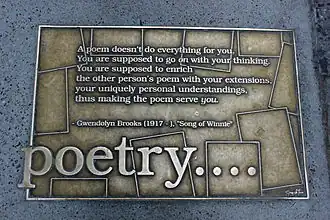 | Prijzen en onderscheidingen | Guggenheim-lidmaatschap (1946),[7] National Medal of Arts, National Women's Hall of Fame (1988),[8] Pulitzerprijs voor Poëzie (1950),[9] Library of Congress Living Legend,[10] Langston Hughes Medal (1979),[11] Anisfield-Wolf Book Awards (1969), United States Poet Laureate (1985), Robert Frost Medal (1989),[12] Jefferson Lecture (1994), Eunice Tietjens Memorial Prize (1949),[13] Black Literary Hall of Fame (oktober 1998),[14] Kuumba Liberation Award (1969), Fellowship of the Academy of American Poets (1999),[15] Shelley Memorial Award (1976),[16] honorary degree from Spelman College (1986),[17] Order of Lincoln | |