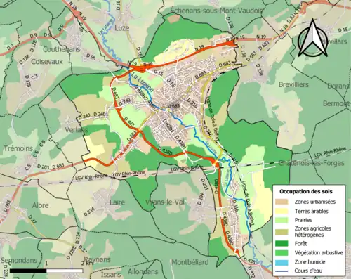 De onderstaande kaart toont de ligging van Héricourt met de belangrijkste infrastructuur en aangrenzende gemeenten.
