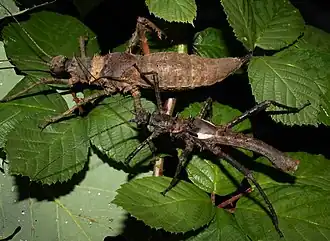 De dieren zijn afkomstig uit Borneo en planten zich geslachtelijk voort. Met haar legboor legt het vrouwtje de eitjes in de grond. Deze komen na 9 maanden tot een jaar uit. Na meer dan tien maanden zijn de nimfen volwassen. Volwassen mannetjes worden 7 cm groot, vrouwtjes ongeveer 10 cm.
