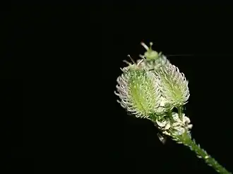 De rond-eivormige, zwartpurperen splitvrucht is een 1,5-5 mm lange en 1-2,5 mm brede splitvrucht. Aan de punt van de twee deelvruchtjes zitten gebogen stekels zonder weerhaakjes, waarmee de vrucht zich vasthecht aan de vacht van dieren of veren van vogels.