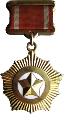 De onderscheiding is een tienpuntige ster met gouden stralen aan een klein rood lint met twee witte strepen en gouden gespen aan boven- en onderzijde. In het midden van de ster is een gouden vijfpuntige ster op een rond wit medaillon uitgespaard.