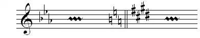Om de toonsoort Es groot (drie mollen) te wijzigen in E groot (vier kruizen) wordt elke verlaging hersteld en na de dubbele maatstreep de nieuwe voortekening geschreven.