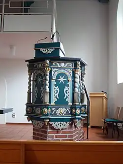 Het eenvoudige interieur heeft een houten tongewelf. Vermoedelijk werd de met houtsnijwerk en gedraaide hoekzuiltjes versierde preekstoel door Frerick Albers gebouwd. De kuip staat vrijstaand van de muur en is op een gemetselde voet geplaatst. Voor de westelijke galerij met het orgel staan de avondmaalstafel en een houten doopvont uit 1862. De oostelijke galerij is van recentere datum.