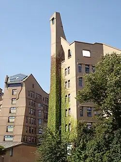 De vormgeving van het gebouw wordt gekenmerkt door het vermijden van rechte hoeken. Dit in tegenstelling tot de toen in de mode zijnde rechthoekige opzet van zowel nieuwe kantoren als de omliggende woonflats. Ton Alberts zei in het NRC Handelsblad van 14 februari 1987: "Tussen 0 en 90 graden zijn nog 89 andere graden". Het bijzondere daarbij was dat er schuine bakstenen geleverd moesten worden. De leverancier wilde daarin wel toestemmen maar bepaalde wel dat alle bakstenen afgenomen moesten worden, ook de 'misbaksels'. Het leverde een gebouw op waarbij niet alle bakstenen dezelfde kleur hebben.[4]