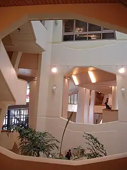 In het interieur wordt het eenvoudige materiaalgebruik en het vermijden van rechte hoeken voortgezet. Ook de beplanting wordt voortgezet in het interieur en is duidelijk aanwezig in de vides die elk van de torens heeft. Er zijn bovendien waterpartijen, die deels worden gevuld met opgevangen regenwater. Het belangrijkste element in het interieur is de binnenstraat, die alle delen van het gebouw verbindt. De binnenstraat heeft een afwisselend karakter door een slingerend verloop met vele vides en doorkijkjes. Delen van het interieur, zoals de lampen, de deuren en de balustrades, zijn speciaal ontworpen voor het gebouw.