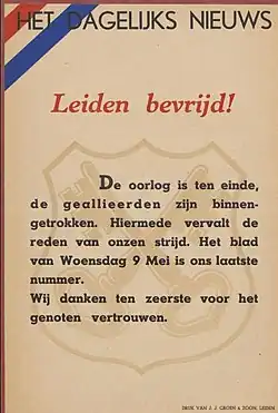 Het laatste nummer, 2e jrg. nr. 279 van 9 mei 1945, begint met een 'Ten afscheid'.[2] vanwege het feit dat Nederland werd bevrijd. Daardoor kon de anonimiteit van de bij de verzetskrant betrokkenen worden vrijgegeven: