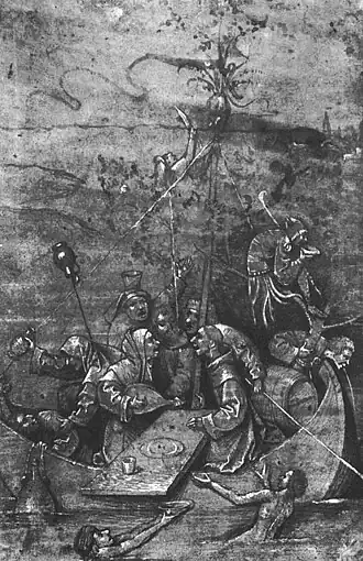 Het werk wordt vaak vergeleken met het gedicht Narrenschiff (Het narrenschip) van Sebastian Brant, uitgegeven in 1494. In dit gedicht wordt verteld hoe een aantal schepen met narren koers zetten naar Narragonia, het land der dwaasheid. Het is gebaseerd op de allegorieSchip der dwazen afkomstig uit boek IV van Plato's Staat, over een schip met een disfunctionerende bemanning. Het gedicht is bedoeld als satirische kijk op de samenleving, inclusief de geestelijke stand. Hoe dit gezelschap doelloos en stuurloos rondvaart beschrijft hij in de volgende strofe: